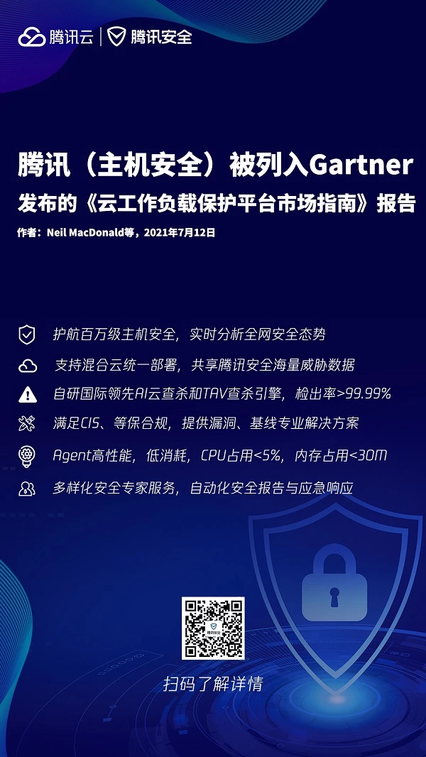 日前,全球权威信息技术研究和顾问公司Gartner发布2021年《云工作负载保护平台市场指南》Market Guide for Cloud Workload Protection Platforms(CWPP)报告,腾讯(主机安全)Cloud Workload Protection(CWP)产品再度被列入,这也是本年度被列入的第三份Gartner CWPP相关报告。