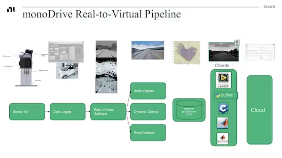 数字孪生技术是建立虚拟场景库的利器,数字孪生指的是把真实的场景一比一的放在虚拟环境中,生成一个孪生系统。NI 近期收购了自动驾驶汽车开发的超高保真仿真软件的领导者monoDrive,利用monoDrive工具进行数字孪生,重构一个高保真度的场景。monoDrive可以把真实驾驶环境中的树叶、栏杆、地面上的标志图形完整地复现出来,甚至包括天气和路面积水情况,还原度非常高。