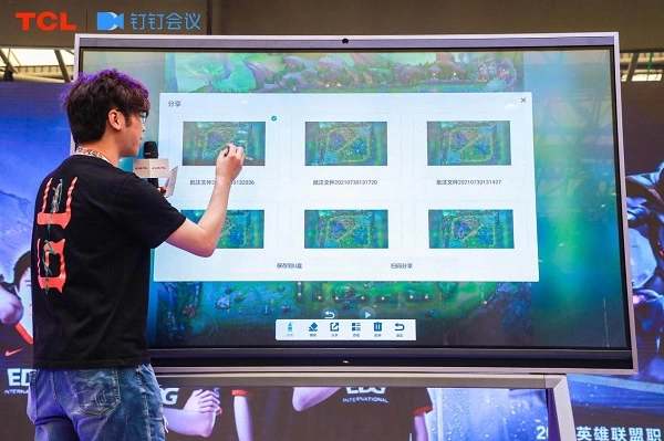 要知道,通过与钉钉会议深度合作,TCL NXTHUB V60极大地锐化了会议平板的“智慧协同”属性。作为行业首款钉钉安卓会议平板,TCL NXTHUB V60打开钉钉就可以直接投屏,无需额外配件,PC、手机、平板皆可投屏。可以看到,EDG战队刚刚的对局回放,一键就从PC分享到TCL NXTHUB V60上。TCL NXTHUB V60还兼容投屏器投屏、Type-C等各类投屏方式。不止是多种投屏方式那么简单,TCL NXTHUB V60还具备“双向操作”的黑科技,只见EDG的队员在PC上进行批注、翻页等操作,TCL NXTHUB V60上立马同步呈现。