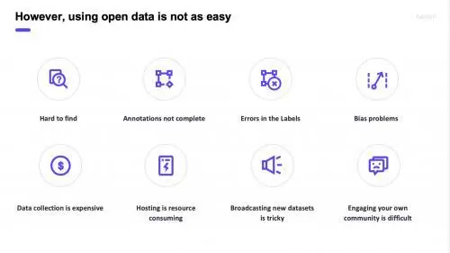 崔运凯总结了目前使用公开的数据集存在的主要痛点,包括了查找公开的数据集有难度,不是所有的公开数据集都标注完整,部分公开数据集的标注存在错误,以及数据集本身存在偏差。不仅如此,数据的托管、宣传,社群的运营、互动也需要很多资源和精力。