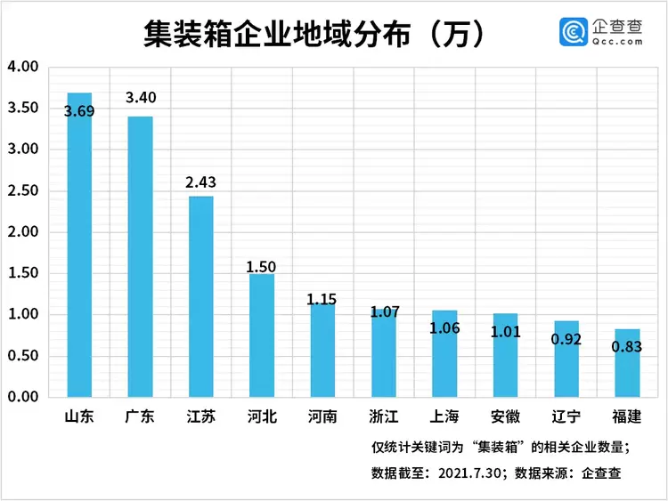 从地域分布来看,山东省作为沿海港口省份,集装箱企业数量多达3.69万家,居于榜首。广东共3.40万家,与山东省不相上下。江苏、河北以及河南等地的集装箱企业数量排名靠前。