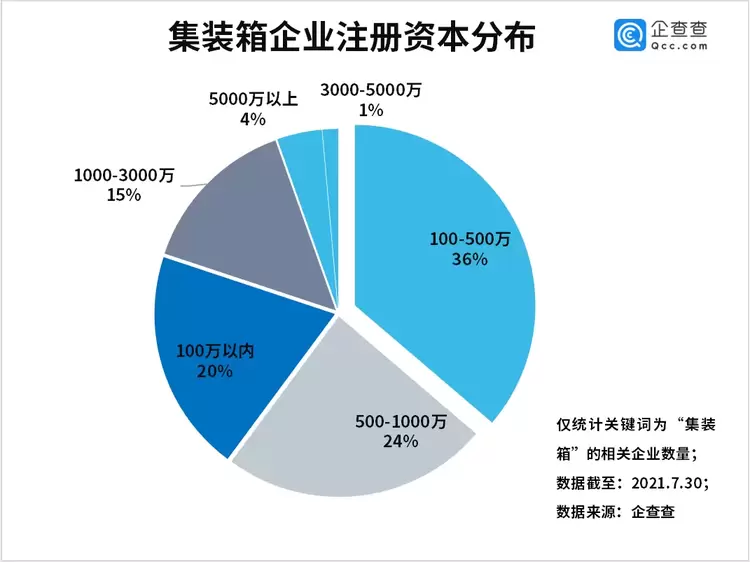 从注册资本来看,集装箱相关企业的注册资本规模普遍不大,100-500万元的占比达36%。注册资本在500-1000万元和100万元以内的分别占24%和20%。