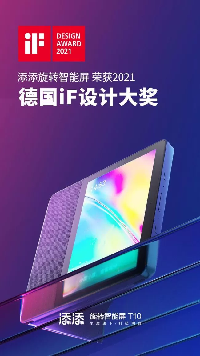 今年5月问世的添添旋转智能屏T10,是小度新品牌“添添”旗下的首款科技潮品,也是小度首创且与市面上已有产品品类、形态完全不同,能够引领行业趋势和潮流趋势的“新物种”,横屏追剧、看大片,竖屏购物、刷抖音,10.1英寸大屏用起来比手机更爽。凭借竖直放置也可以稳定适用的创新外观设计,该产品一举斩获2021年德国“iF设计奖”。针对年轻人喜欢“K歌”娱乐需求,添添旋转智能屏T10与全民K歌携手打造家庭K歌新场景,通过双方技术打磨与适配,完成了软硬件一体化的全面对接和打通。此外添添旋转智能屏T10还接入了支付宝AMPE小程序服务,用户可以使用添添设备上的支付宝小程序来购物、点外卖、点奶茶、买电影票等,全面满足用户在线购物、支付需求。