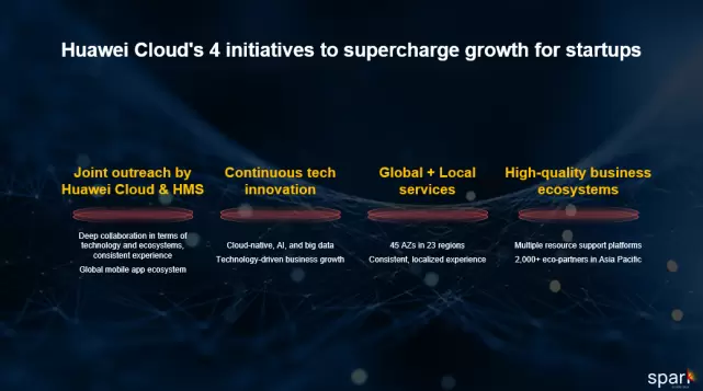 张平安介绍,华为云始终关注初创企业成长,在多个地区搭建了初创生态平台,并联合区域政府、顶级孵化器、知名VC和高校等机构,共同助力初创企业成长。Spark Program即是华为面向亚太区域重磅发布的初创扶持计划,通过云云协同等四大举措,一年多时间已成功招募40家初创企业,帮助4家企业推出新品,实现业务转型升级、8家企业获得市场拓展。