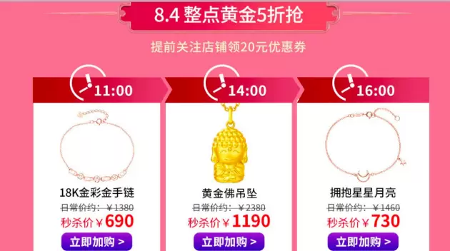 活动不仅有黄金每满498减100的福利,在活动预热期每天一款限量6折秒杀,8月4日整点黄金5折抢等活动,比如原价1380的18K金彩金手链秒杀价690元,原价2380的黄金佛吊坠秒杀价1190元……每款限量秒杀,秒完为止。