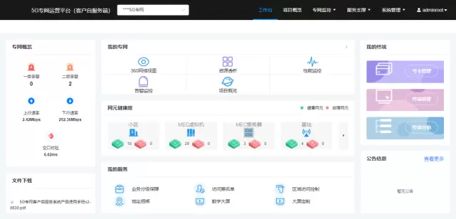该自助服务客户端可为客户提供专网资源、性能、告警等网络信息的一点可视,也可帮助客户对号卡、终端进行精细化管理;客户可在线进行业务开通、业务变更等操作,极大提升了应答效率;为客户提供专属客服服务,客户可通过客户端进行业务咨询与故障投诉,相关业务专家和运维人员将利用5G专网运营平台对客户的咨询与投诉进行集中响应。除此之外,客户端还支持客户自助管理,客户可自行账号分权、自行发布公告、自行管理专网网元和专网服务,同时还为客户提供了一系列定制化服务,包括能力开放、运营大屏自配置、告警性能自主订阅等。