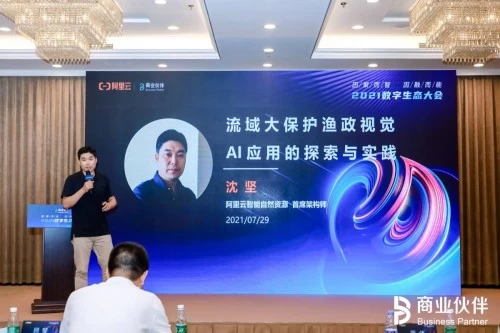 论坛上,阿里云智能自然资源资首席架构师沈坚以“流域大保护渔政视觉AI应用的探索与实践”为题展开论述。