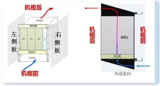 该方案可改善风道流向,实现完全前进风后出风,保证BBU出风的热空气完全从机柜后方排出,没有热风回流到BBU入风口,使BBU入风口温度同环境温度接近,有效解决BBU散热问题,散热原理图如下图所示:
