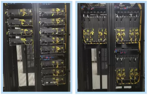 改造后的鄂尔多斯鄂托克前旗中心局机房12台BBU设备,设计3台BBU专用竖插机框安装于2个标准19英寸机柜内,如上图右侧。在外界环境相同的条件下,对比替换前后的BBU温度,BBU平均降温6℃,最高降温12.9℃,设备温度显著降低。同时竖装工艺更加美观,可实现电源类线缆上走线,光纤等信号类线缆下走线,分类走线,避免干扰。