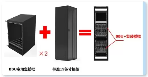 为解决这一难题,内蒙古联通联合中信科移动通信技术股份有限公司(以下简称中信科移动)提出BBU设备竖装方案(BBU专用竖插框安装在标准 19 英寸机柜内)。工程实施原理如下图所示: