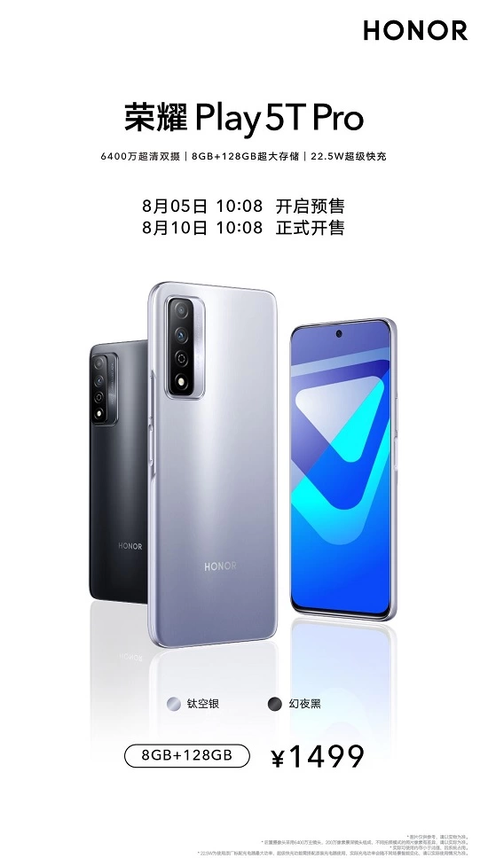 8月5日,荣耀Play5T Pro正式发布,并于当天10:08正式在荣耀商城、各大授权电商开启预售。荣耀Play5T Pro搭载6400万超清双摄,标配8GB+128GB超大存储,4000mAh大电池,支持22.5W超级快充、侧边指纹解锁,有幻夜黑、钛空银两种配色供用户挑选,售价1499元起。