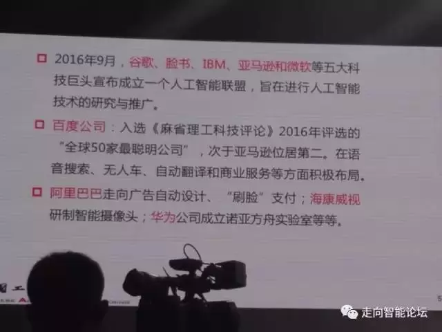 IBM的watson医疗诊断系统已经在中国开始进行实践。在去年9月,美国的5个大的科技巨头宣布成立一个AI联盟,旨在进行AI方面的计算研究和推广。中国的公司也不甘落后,百度早在AI进行了专业布局。阿里巴巴在AI方面也转向很快,他们公司的转向也很明显,杭州的海康威视作为全世界最大生产摄像头的公司,已经开始推出智能化摄像头,把深度学习的芯片和摄像头连在一起,华为公司也在这方面有所布局,尤其是在自然语言理解方面。