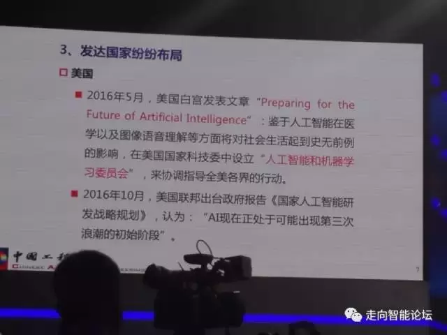 国外发达国家许多政府也重视AI,美国在去年5月份白宫专门发表文章,准备迎接AI的未来,他们决定在美国国家科技委设立AI和机器学习专业委员会,来指导全美各界的行动。到了10月份隔了5个月,美国联邦又出台了一个政府报告,国家AI研发战略规划,并且认为AI现在正处于新浪潮的初始阶段。