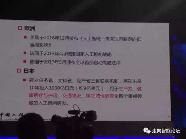 在欧洲,英国去年年底发布《AI未来的决策,制定的机遇和影响》,法国在今年4月份制定了《国家人工智能战略》,德国在今年5月份颁布全国第一部自动驾驶的法律。日本准备在未来10年,要投入100亿日元,用于4个领域的AI的发展,包括基础设施、人才培养、医疗保健和农业等4个领域。