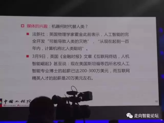 当然媒体更大的兴趣在于机器什么时候代替人类,尤其是有一些科学家,讲的一些有震撼力的话。比如说英国的著名物理学家史蒂芬·霍金说过,在未来100年内结合AI的计算机将会比人类更聪明。当然这些讲话每个人都有不同的理解。