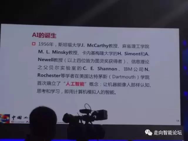 接下来重点介绍人工智能走向2.0。我们知道1956年也就是60年以前,在美国的达特茅斯学院诞生的,当时一批著名的科学家,有斯坦福的麦肯锡、有MIT的Minsky、有CMU的西蒙和Newell,这4个呢是图灵奖获得者,大家可以看到,这3个大学是美国计算机最好的大学,也是AI最好的大学。另外贝尔实验室的香农,IBM的罗切斯特,这也是非常著名的专家,提出了”人工智能“的概念,什么是:让机器像人那样认知、思考和学习,即用计算机来模拟人的智能。