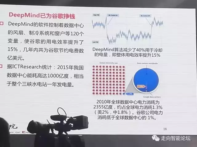 在大数据智能方面,我们看到谷歌收购的Deepmind用阿尔法狗相关技术应用到其他的领域,比如为谷歌数据中心的耗电方面,就做了一个很好的人工智能软件,综合考虑数据中心风扇、制冷系统和窗户、室外天气、还有人的使用情况等等,大约有120个变量,最后是提升了数据中心用电效率,大概15%。这省下的15%,几年内就是数亿美元,等于把谷歌购买Deepmind的这个钱都赚回来,所以大家认为是谷歌是赚了一笔大钱。