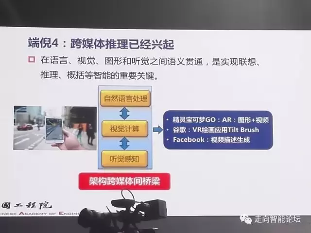 第四个方面跨媒体的智能开始已经形成,计算机现在可以很好的处理图像的信息,处理声音的信息,处理文字的信息,也开始处理语言的信息。但是人在运用这些信息的时候,它不是分开运营,人在解决一个问题的时候,是同时运用世界的信息,声音的信息,语言的信息,共同来支撑它进行创新性识别和听觉识别。计算机在前60年没有完全解决这个问题,有一部分中国的科学家和世界各国的科学家一起沿着这个方向正在努力,我想在今后的60年中间,AI2.0,应该在这方面取得重大的进展。