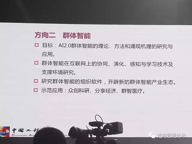 现在我讲最后一部分,中国新一代AI的重点方向,新一代AI工程研究建议从以下5个方面进行认真研究,第一大数据智能,第二群体智能,第三跨媒体智能,第四人机混合的增强智能,第五自主智能系统。它的应用包含智能城市、智慧医疗、智能制造等等,大数据智能因为这几个下面有很多专业术语,所以我就不详细讲了,第二方向群体智能,第三跨媒体智能,第四人机混合的增强智能,第五自主智能系统。最后讲一下应用。