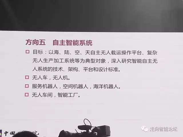 第五个阶段,无人系统迅速发展。人工智能开始的时候,是用计算机来模拟人的行为,所以把它称为机器人,但是60年的发展,机器人固然发展的很快,但是比机器人更快的,是无人系统,无人飞机,无人车,无人车一上的话那我们满街都是机器人,为什么?因为去模拟人并不是智能化最好的办法,我们可以看到,机器人一些精彩的发展,这是美国波士顿动力公司做的机器人,这是全世界做机器人最好的公司之一,两腿机器人和四脚机器人,四脚机器人也就是美国军方过去用的。