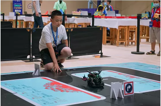 除了技术亮点,还有情怀亮点。智能驾驶赛项特别设置“无人车走百年路”路线,用地图上的百年历程传承红色基因,厚植爱国主义情怀,将中国共产党坚毅前行的奋斗历程牢记于心,为本次比赛增添了更加有历史意义的红色精神。小选手们更是别出心裁,为小车设计出了很多主题外观,警车、消防车、救护车等等,展现出小选手们超乎年龄的智慧与创造力!