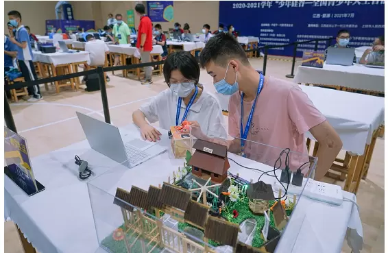 口罩佩戴智能监测系统,表现出疫情防控成为常态下,小选手对日常生活的思考和建议;智能快递分拣机器人,是细心观察生活后,贴心减轻快递人员工作量的设计;土地自动灌溉系统,在各种极端天气下,一款智能种植农作物的创作;智能电梯卫士,是对电梯事故频发的思考,自动识别电动车并阻断电梯关门装置、紧急按钮一键警报装置,电梯厢语音报警装置,一款降低安全隐患的创意佳作......
