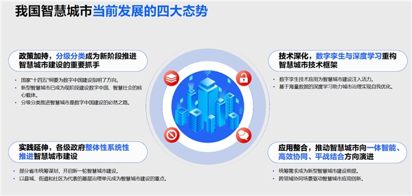 在此阶段,以北京、上海等为代表的一线城市及二线城市已早早布局智慧城市建设,加快城市“数字化转型”。对于我国智慧城市当前的发展态势,黄艳分析称将主要集中在四个方面,“第一个是政策方面,国家明确提出要分级、分类地推动我们智慧城市建设,分级是侧重于区分城市规模的大小,分类强调的是根据城市现有的数字化基础;第二个是技术方面,数字孪生技术和以深度学习为代表的人工智能技术重构了智慧城市架构,也为未来智慧城市建设重点带来了新的变化;第三是应用整合,推动我们智慧城市建设向一体化智能、高效协同和平战结合发展;第四个是各级政府都在努力改变以往各部门单打独斗的项目模式,探索整体性系统性的推进智慧城市建设。”