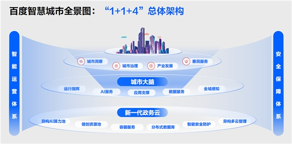 结合为智慧城市的发展需求,百度推出了百度智慧城市全景图:通过部署了一个自主可控的新一代智能政务云底座、构建一个“云智一体”的城市大脑、深度赋能城市洞察、城市治理、产业发展和惠民服务等四大领域智慧应用场景,加上百度的智能运营体系和安全保障体系,打造出了“1+1+4”的智慧城市全景图。