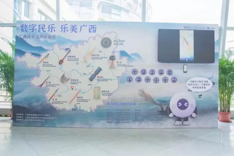 展览背景板上详细地展示了乐器的流行地区,例如在广西地区分布最广、数量最多地铜鼓、外形酷似唢呐,流行于广西崇左龙州、宁明等地地壮族民间气鸣乐器波咧等。游客可直观地了解到乐器起源,如果想了解更多的乐器知识,还能求助现场的小布助手。