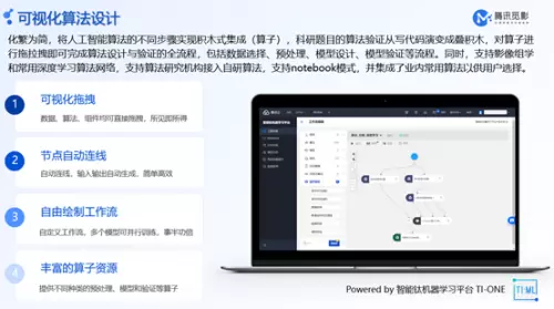 为帮助行业提高AI算法开发效率, 同时满足用户对算力的不同需求,升级后的开放实验平台秉承“化繁为简”的理念,为用户提供了简易的算法设计方式和灵活的算力配置。基于腾讯智能钛机器学习平台,用户可以对算子进行拖拉拽搭,将人工智能算法的不同步骤实现“积木式”集成,即可完成可视化的算法设计与验证的全流程,无须再亲自写代码。另一方面,平台支持影像组学和常用深度学习算法网络,支持算法研究机构接入自研算法,支持notebook模式,并汇聚不同类型影像的AI识别算法模型、业内常用算法、灵活的算力配置以供用户选择,方便各行业借助全套AI训练模型验证自身在医学中的概念,快速生成应用,极大地降低了使用门槛,也为用户节省了高昂的算法学习成本。