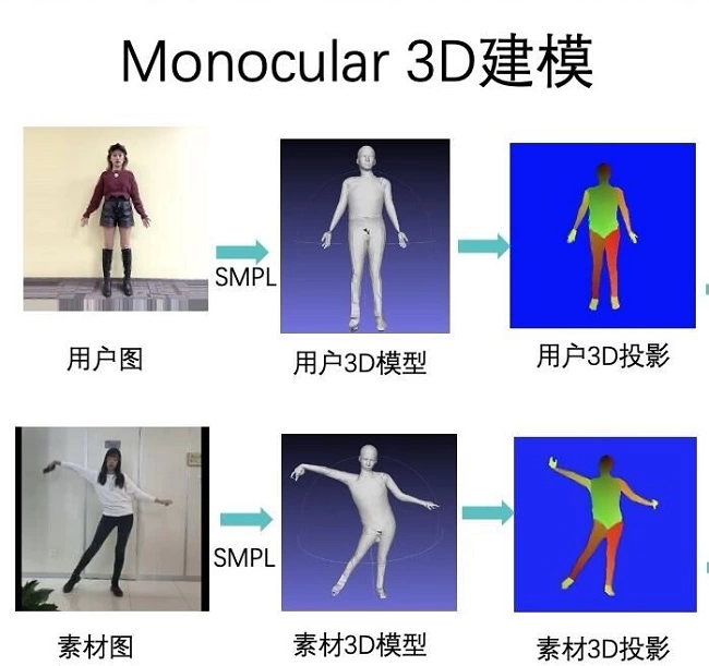 区别于人脸特效功能,围绕人体的GAN生成落地难度较大。在人体动作迁移实现过程中,动作跨度大、像素搬移多、纹理复杂、动作自由度高和自遮挡频繁等干扰因素导致生成指定姿态的人体一直比较困难。目前,主流的人体人体姿态迁移方案有2D warp、3D warp和不依赖warp的解决方案,这三种方式各有利弊,且并未真正落地于实际商业生产应用。
