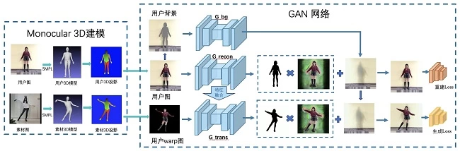 而针对3D warp图纹理信息粗糙的现象,则利用GAN网络来细化(refine)用户warp图。具体做法是将用户信息与warp图信息在GAN网络中融合,生成自然的目标姿态用户图。在这一步中GAN网络又分为两个子网络,分别是重建网络与姿态生成网络。将用户图重建,之后生成网络输入粗粒度warp图,之后接受重建网络的特征图并进行特征融合,以保证细节信息的准确性,之后特征图将进入解码器,融合前景和特征图,最后得到输出图。