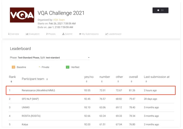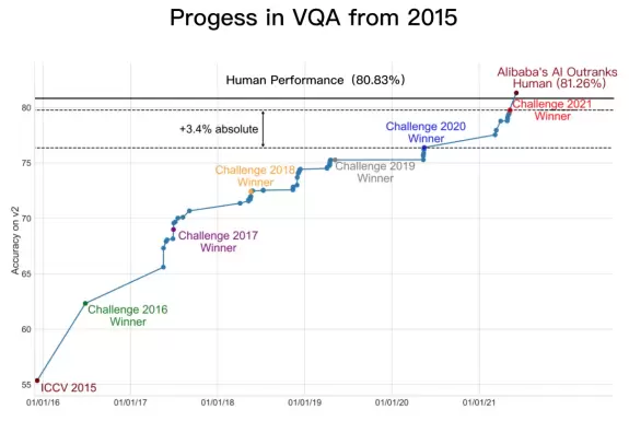 今年6月,阿里达摩院在VQA 2021 Challenge的55支提交队伍中夺冠,成绩领先第二名约1个百分点、去年冠军3.4个百分点。两个月后,达摩院再次以81.26%的准确率创造VQALeaderboard全球纪录,首次超越人类基准线80.83%。