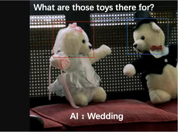 (VQA考题列举,根据有礼服装饰的小熊玩具照片及问题“这些玩具用来做什么的?”达摩院AliceMind成功推理出一个可能的答案“婚礼”)