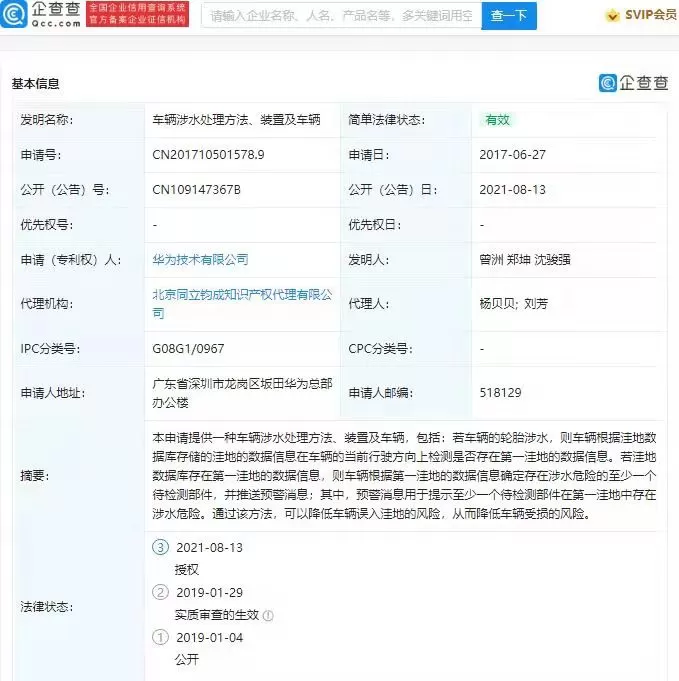 企查查APP显示,8月13日,华为技术有限公司“车辆涉水处理方法、装置及车辆”专利获授权,公开号为CN109147367B。