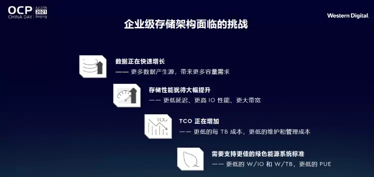 首先,存储性能亟需大幅提升,以实现更低的延迟、更高的IO性能和更大的带宽;其次,对于企业来说,成本永远是最重要的,也就是要求存储系统的总体拥有成本(TCO)要尽可能的低;最后在能耗方面,例如我国“30·60”碳达峰和碳中和的目标,因此数据中心还面临着绿色环保的要求。