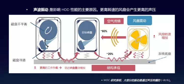 对于分布式存储系统来说,硬盘部署密度已经可以达到4U106,高密度的大容量机械硬盘的部署,虽然可以为数据中心降低成本,但也带来了一些问题,例如:声波振动。