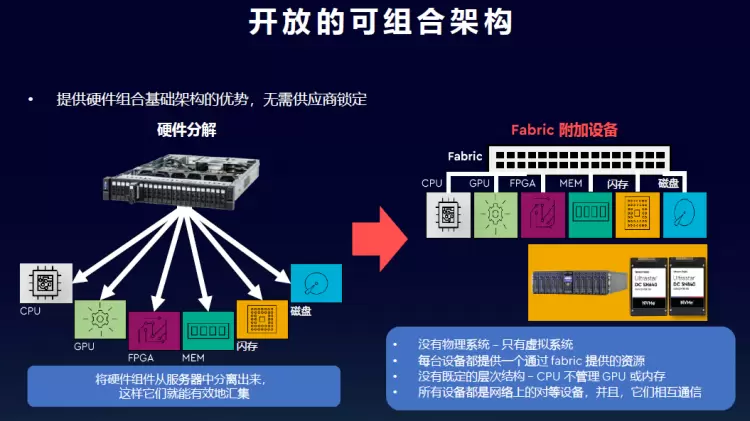 另外,西部数据还推出了一系列新型共享存储平台及服务器,帮助用户过渡到更高效、更优质的共享存储架构,从而满足高性能应用和工作负载不断变化的存储需求。也就是开放式可组合的分解式架构,也是未来开放计算硬件部分的一个趋势。