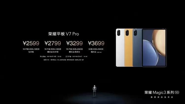 本次发布荣耀平板V7 Pro包含三款配色选择:晨晖金、曙光蓝、钛空银, 内存为6GB/8GB可选,存储有128G/256G可选,分为Wi-Fi版和5G版,售价2599元起。将于2021年8月12日22:00开始在荣耀商城、各大授权电商,荣耀体验店和荣耀授权店同步开启预售,8月19日10:08正式开售。