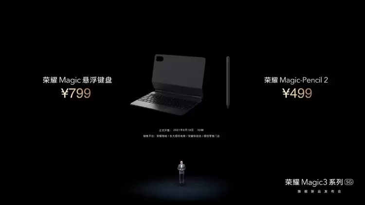 荣耀Magic悬浮键盘799元,荣耀Magic-Pencil 2 499元,将于2021年8月19日10:08在荣耀商城、各大授权电商,荣耀体验店和荣耀授权店同步正式开售。