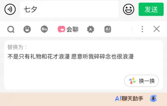 一句情话往往唤醒一段爱情,所以情话说得好,桃花少不了。讯飞输入法『会聊情话』用AI聊天助手定制情话,不油不尬,甜到爆炸!悄悄告诉你,点击“换一换”,可爱体、文艺体、浪漫体等文案,总有一款适合你。