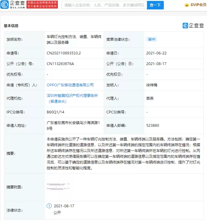 企查查APP显示,8月17日,OPPO广东移动通信有限公司公开“车辆灯光控制方法、装置、车辆终端以及服务器”专利,公开号为CN113263976A。