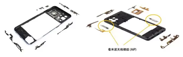 右图:三星Galaxy A42中发现的包含两个毫米波天线模组的天线阵列。