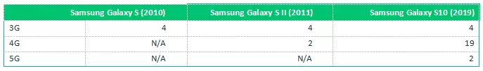 随着5G手机中的无线频段和射频元件的数量的增加,设计一个同时支持三代蜂窝无线技术的射频前端变得更加困难。下表说明了随着3G、4G和5G网络中支持的频段数量的增加,导致射频部分复杂性的失控式增长;对比11年前三星Galaxy系列的第一代设计,我们可以看到伴随每一次移动网络的迭代而带来支持更多射频频段的需求,以及不断增加的无线带宽对射频前端设计要求的提高。这意味着手机厂商需要着重致力于在控制成本膨胀而产品体积受限的情况下设计出更高性能的射频前端。