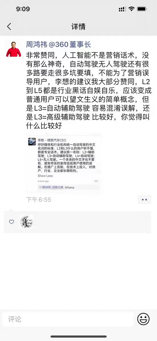 360创始人、董事长周鸿祎表示赞同。他认为,“人工智能不是营销话术,没有那么神奇,自动驾驶无人驾驶还有很多路要走很多坑要填,不能为了营销误导用户,李想的建议我大部分赞同,L2到L5都是行业黑话自娱自乐,应该变成普通用户可以望文生义的简单概念,但是L3=自动辅助驾驶容易混淆误解,还是L3=高级辅助驾驶比较好,你觉得叫什么比较好”。