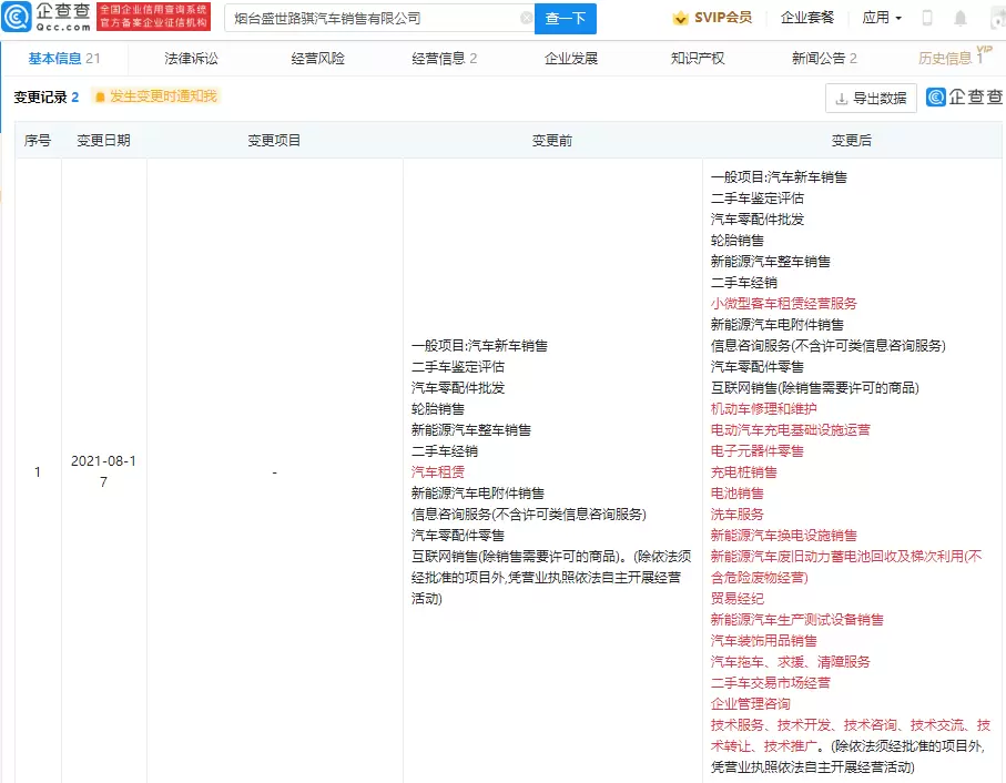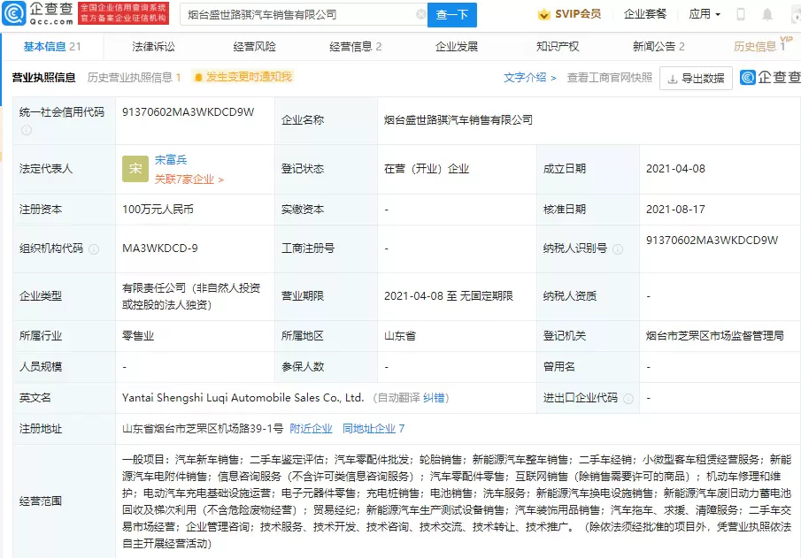企查查APP显示,8月17日,烟台盛世路骐汽车销售有限公司发生工商变更,公司经营范围新增小微型客车租赁经营服务;电动汽车充电基础设施运营;充电桩销售;新能源汽车生产测试设备销售;二手车交易市场经营等。