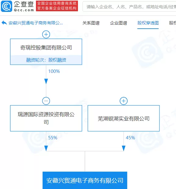 企查查信息显示,该公司成立于2015年,法定代表人为王家斌,注册资本3000万元人民币,由瑞源国际资源投资有限公司、芜湖银湖实业有限公司共同持股,前者为奇瑞控股集团有限公司全资子公司。