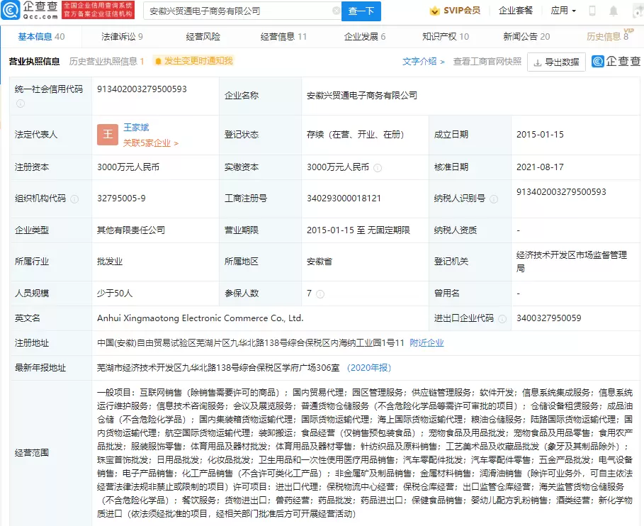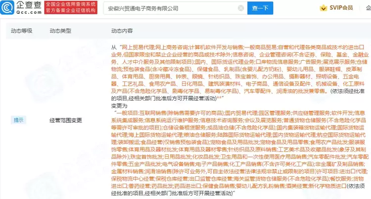 企查查APP显示,近日,安徽兴贸通电子商务有限公司发生工商变更,公司经营范围新增供应链管理服务;餐饮服务;兽药经营;药品批发;酒类经营等。