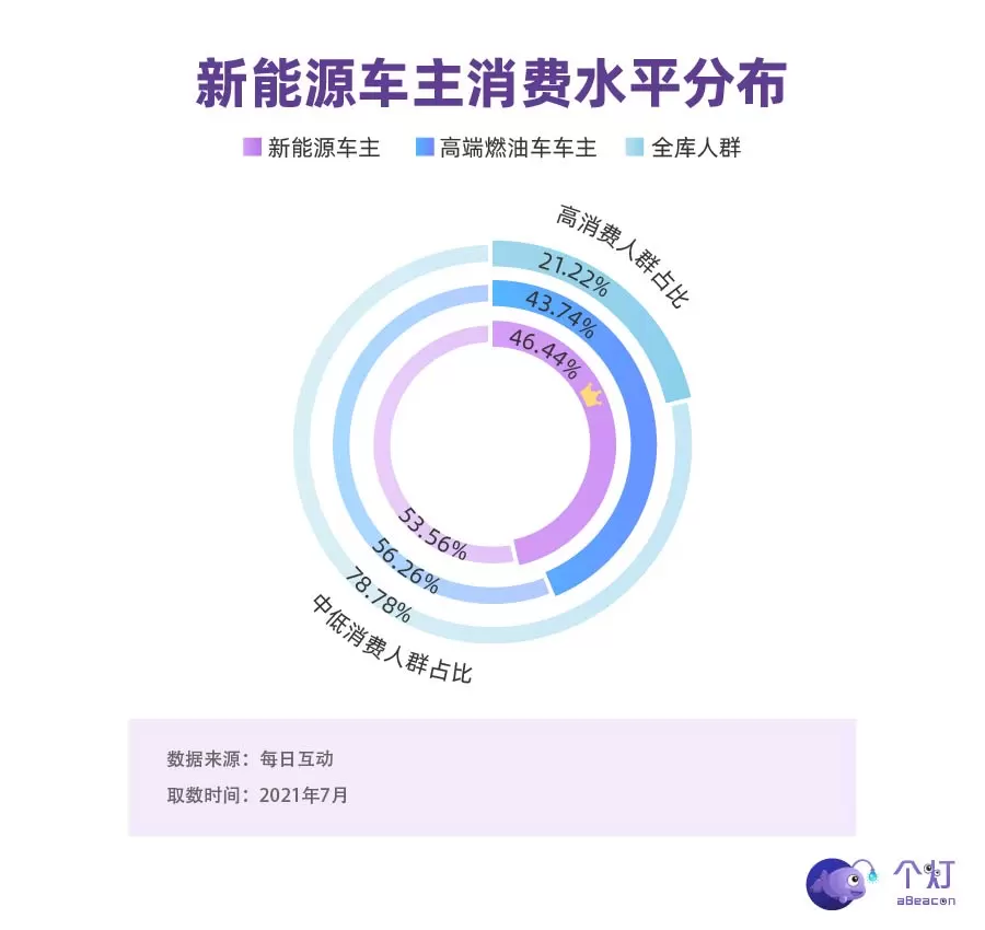 我们还通过数据对新能源车主人群的消费水平进行了洞察。数据显示,新能源车主中高消费特征人群占比达46.44%,是燃油车车主中高消费特征人群占比的1.06倍,新能源车车主的消费实力着实不容小觑。