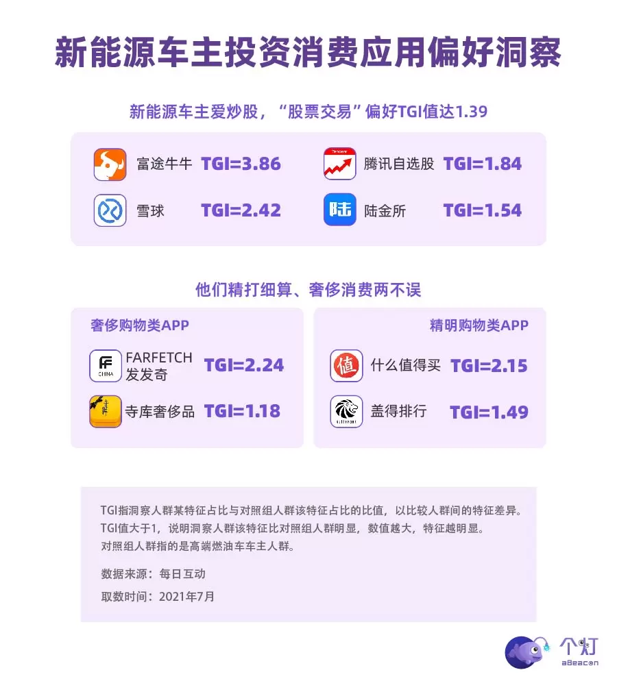 个灯依托每日互动全网大数据,使用人群洞察工具“个灯数盘”筛选出安装有特斯拉、蔚来、理想、小鹏等高端新能源汽车品牌相关App的人群,并对其进行了深入洞察。